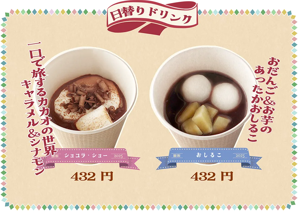 今回のお菓子はあんこをテーマに和の雰囲気。ピッタリマッチする令和版和菓子・洋菓子にアレンジ!さらにほっこり美味しい日替わりドリンクメニューも販売いたします。